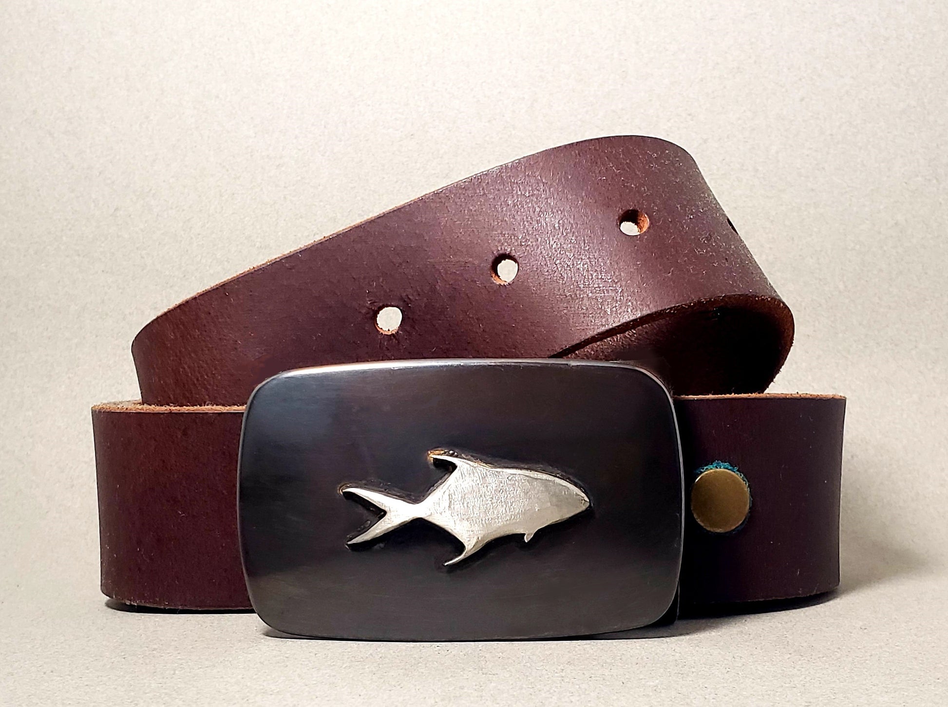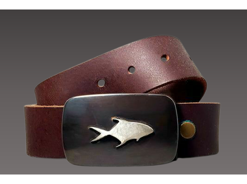 This buckle is partnered with a full grain buffalo leather belt. Buffalo is thicker, softer, more flexible, stronger, and resists abrasion better than cow leather. Read more about your 1.5 inch wide buffalo leather belt here.