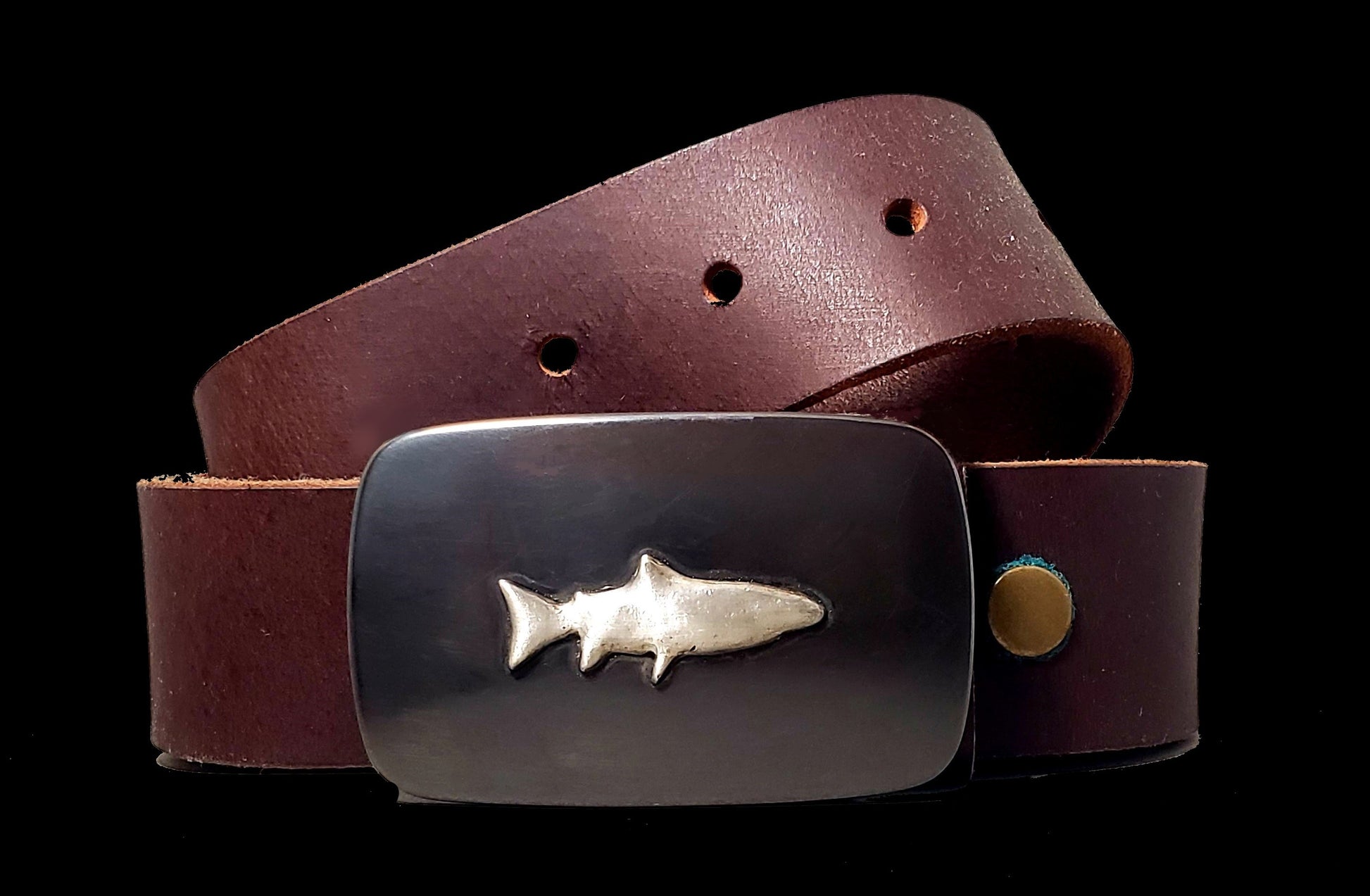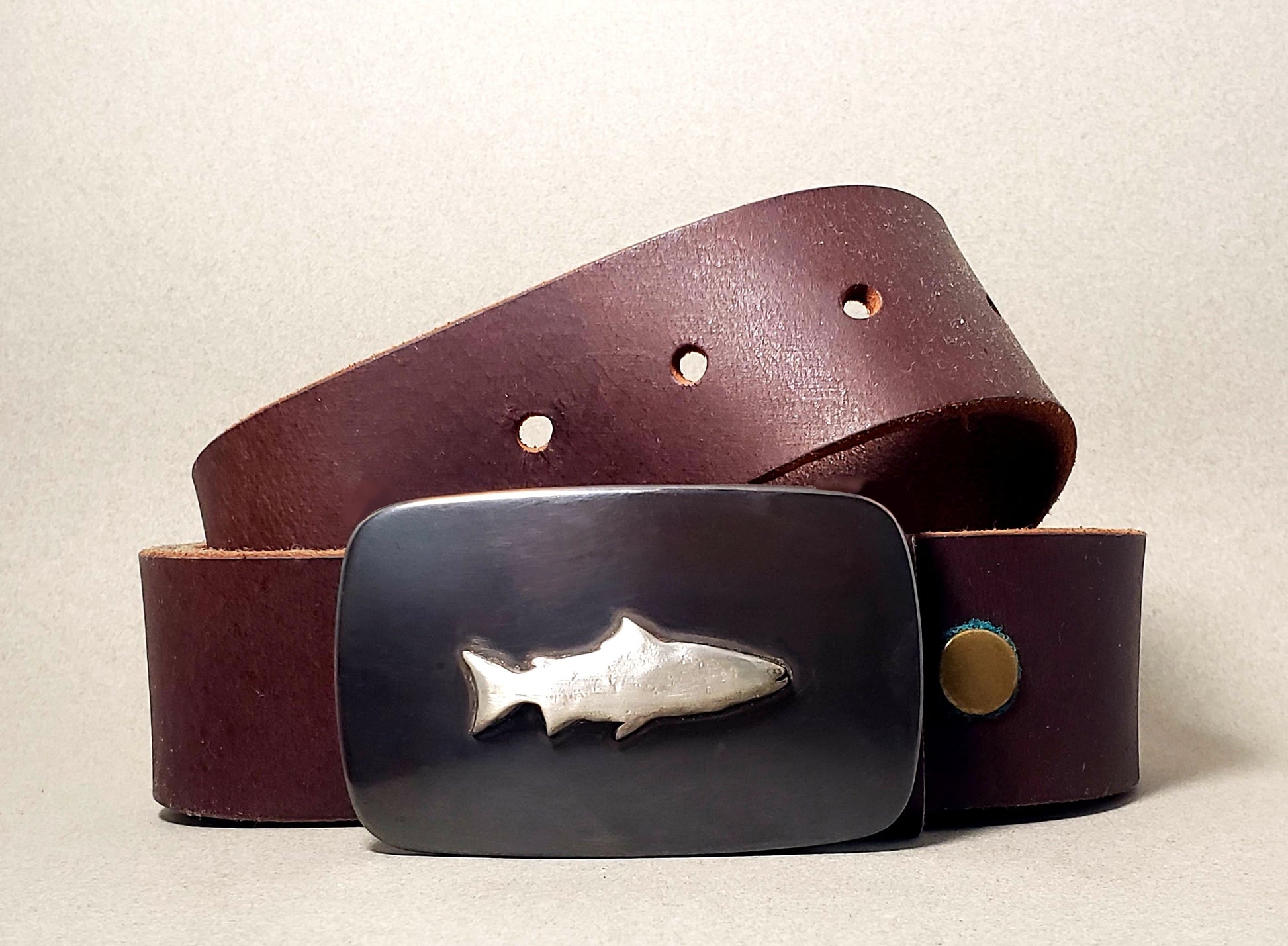 This buckle is partnered with a full grain buffalo leather belt. Buffalo is thicker, softer, more flexible, stronger, and resists abrasion better than cow leather. Read more about your 1.5 inch wide buffalo leather belt here.