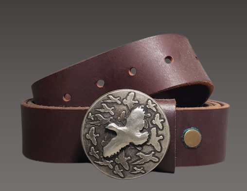 This buckle is partnered with a full grain buffalo leather belt. Buffalo is thicker, softer, more flexible, stronger, and resists abrasion better than cow leather. Read more about your 1.5 inch wide buffalo leather belt here.
