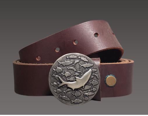 This buckle is partnered with a full grain buffalo leather belt. Buffalo is thicker, softer, more flexible, stronger, and resists abrasion better than cow leather. Read more about your 1.5 inch wide buffalo leather belt here.